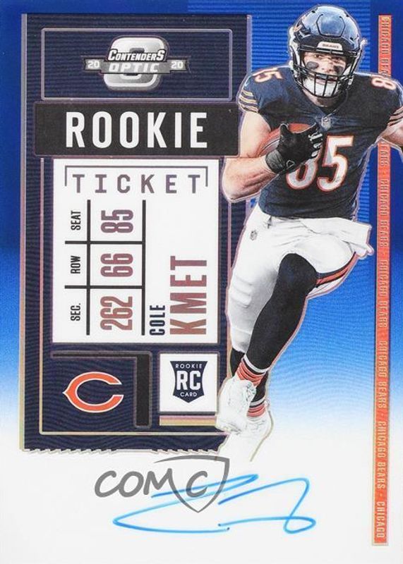 The Cole Kmet 2020 Contenders Optic #118 Rookie Ticket Auto - Blue /75 card in Raw condition has not changed in price in the last 30 days and was last sold for $8.27 .