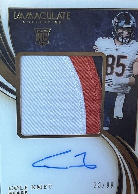 The Cole Kmet 2020 Immaculate #PPR-CKM Premium Patch Rookie Autographs (/99) card in Raw condition has not changed in price in the last 30 days and was last sold for $46.00 .