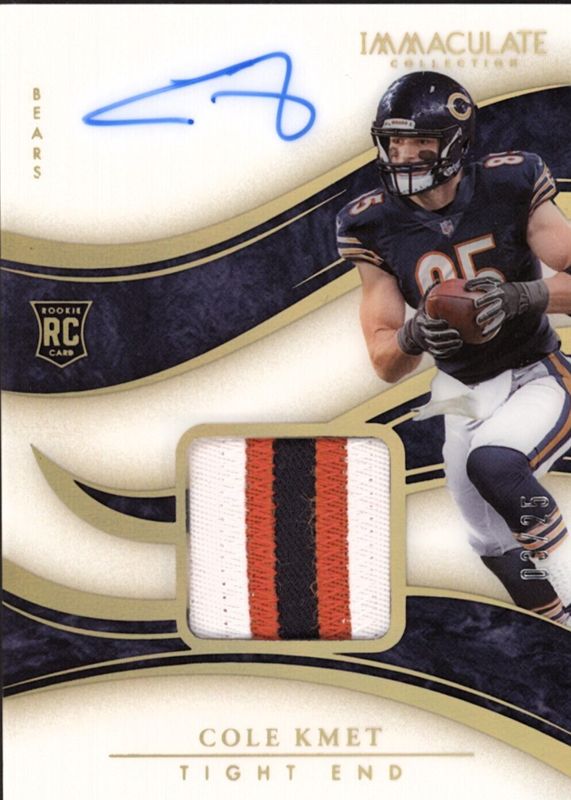 This card is 1 of 24 Cole Kmet's card variations in the 2020 Immaculate set being tracked by Sports Card Investor, including Immaculate Introductions Autographs (/25), Immaculate Numbers Rookie Patch Autographs (/85), Immaculate Rookie Eye Black Jersey Autographs (/99), Immaculate Rookie Signature Patches (/99), and Premium Patch Rookie Autographs (/99).