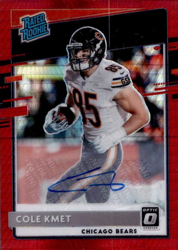 The Cole Kmet 2020 Optic #181 Rated Rookie Autographs - Red Hyper card in Raw condition has not changed in price in the last 30 days and was last sold for $11.01 .