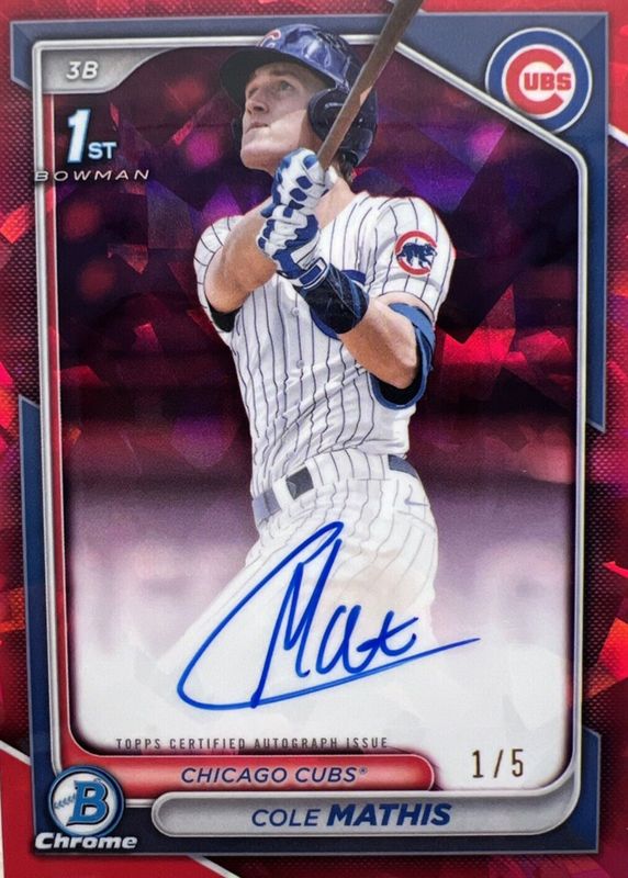 Recent Sales of Cole Mathis 2024 Bowman Draft Sapphire Edition #CPA-CMS Chrome Prospect Auto - Red /5 (1st) Raw