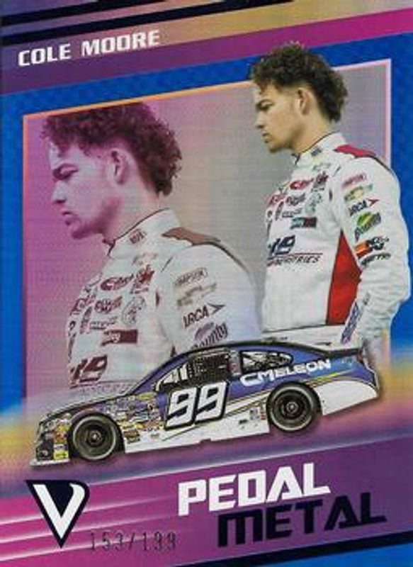 The Cole Moore 2023 Chronicles NASCAR #6 Pedal to the Metal - Blue /199 card is 1 of 25 Cole Moore's card variations in the 2023 Chronicles NASCAR set being tracked by Sports Card Investor, including Base, Blue /199, Red /99, Purple /25, and Gold /10.