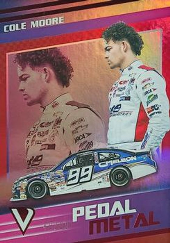 The Cole Moore 2023 Chronicles NASCAR #6 Pedal to the Metal - Red /99 card is 1 of 25 Cole Moore's card variations in the 2023 Chronicles NASCAR set being tracked by Sports Card Investor, including Base, Blue /199, Red /99, Purple /25, and Gold /10.