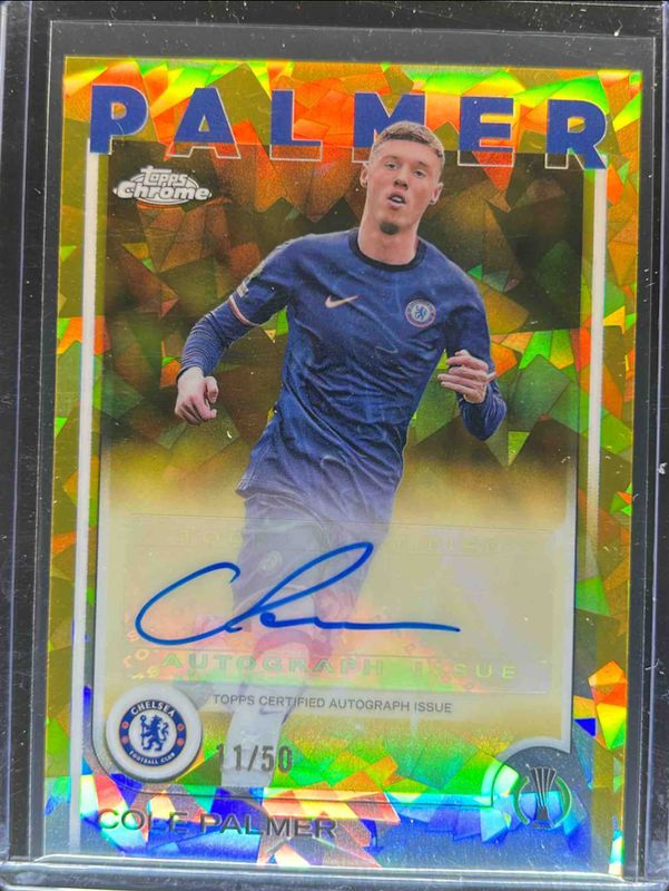 The Cole Palmer 2024 Topps Chrome Sapphire UEFA Club Competitions #CA-CP Chrome Autographs - Gold /50 card is 1 of 25 Cole Palmer's card variations in the 2024 Topps Chrome Sapphire UEFA Club Competitions set being tracked by Sports Card Investor, including Base, Green /99, Yellow /75, Gold /50, and Orange /25.
