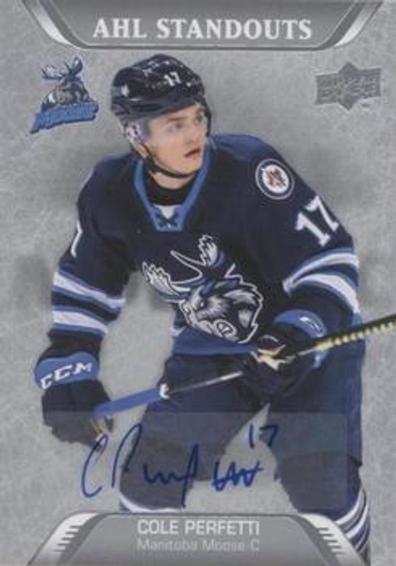 The Cole Perfetti 2020 Upper Deck AHL #233 Autographs card is 1 of 12 Cole Perfetti's card variations in the 2020 Upper Deck AHL set being tracked by Sports Card Investor, including #153 Base, #233 Base, #233 Red, #153 UD Exclusives /100, and #233 Gold /25.