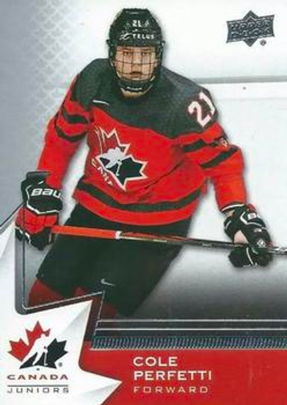 The Cole Perfetti 2020 Upper Deck Team Canada Juniors #1 Base card is 1 of 37 Cole Perfetti's card variations in the 2020 Upper Deck Team Canada Juniors set being tracked by Sports Card Investor, including #112 Base, #142 Base, #75 Base, #75 Exclusives /165, and #112 Exclusives /165.