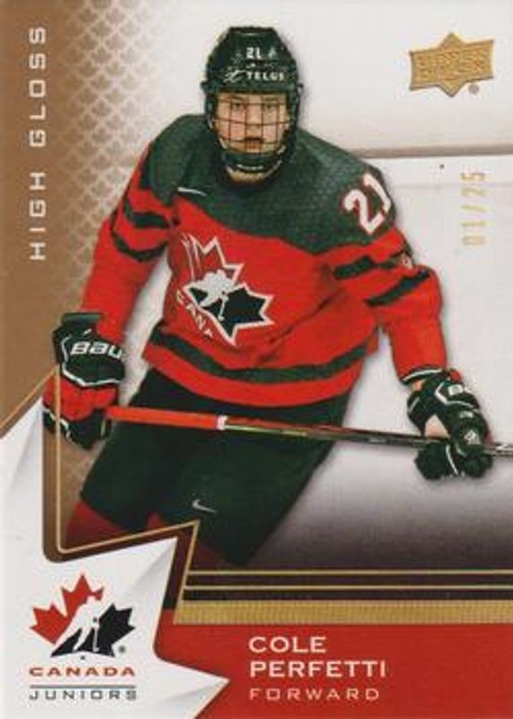 The Cole Perfetti 2020 Upper Deck Team Canada Juniors #1 High Gloss /15 card is 1 of 37 Cole Perfetti's card variations in the 2020 Upper Deck Team Canada Juniors set being tracked by Sports Card Investor, including #112 Base, #142 Base, #75 Base, #1 Base, and #75 Exclusives /165.