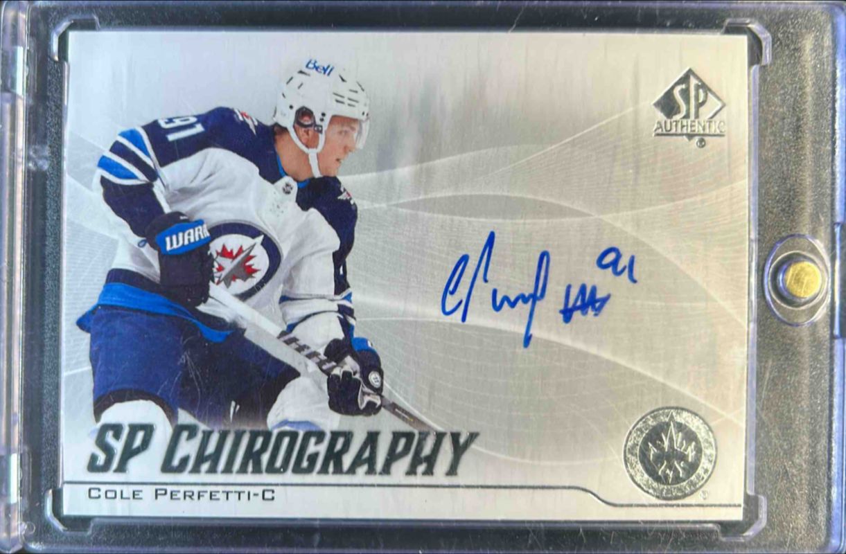 The Cole Perfetti 2021 SP Authentic #C-PE Chirography Rookie card is 1 of 26 Cole Perfetti's card variations in the 2021 SP Authentic set being tracked by Sports Card Investor, including Black Autographs, Limited Red, Limited Gold /99, Limited Black /1, and Future Watch Acetate.