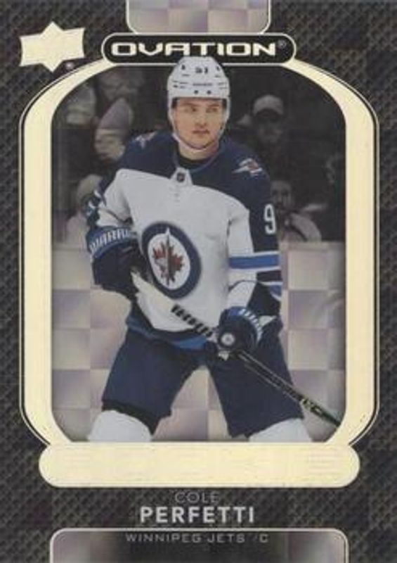 The Cole Perfetti 2021 Upper Deck Ovation #107 Checkerboard Rookie card is 1 of 35 Cole Perfetti's card variations in the 2021 Upper Deck Ovation set being tracked by Sports Card Investor, including Base, Gold Circular Wonder, Gold Foil, Silver Foil, and Standing Ovation /500.