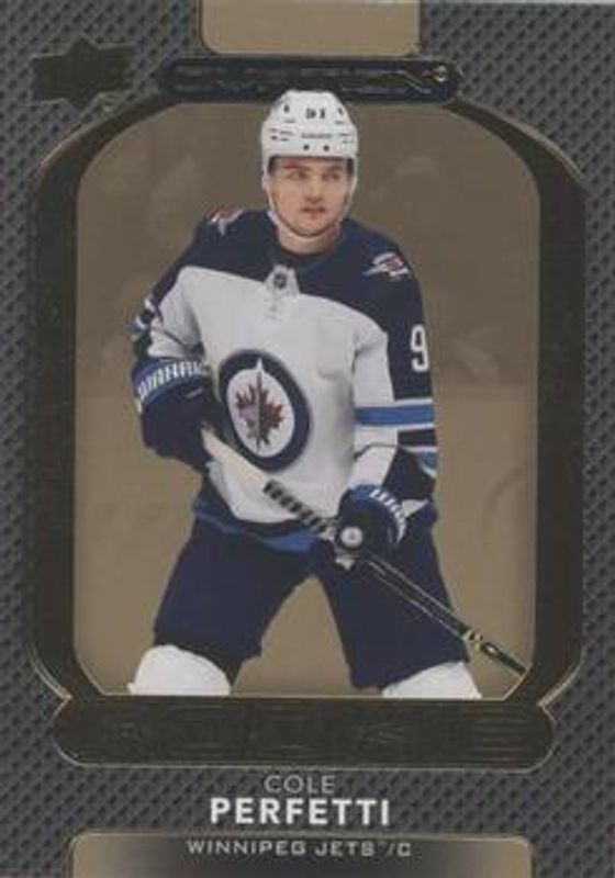 The Cole Perfetti 2021 Upper Deck Ovation #107 Gold Foil Rookie card is 1 of 35 Cole Perfetti's card variations in the 2021 Upper Deck Ovation set being tracked by Sports Card Investor, including Base, Checkerboard, Gold Circular Wonder, Silver Foil, and Standing Ovation /500.