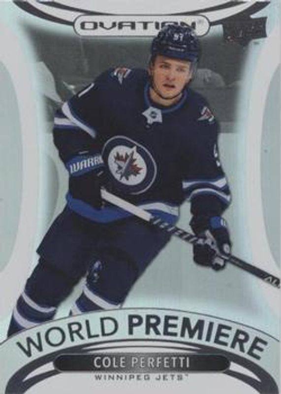 The Cole Perfetti 2021 Upper Deck Ovation #WP-39 World Premiere Rookie card is 1 of 35 Cole Perfetti's card variations in the 2021 Upper Deck Ovation set being tracked by Sports Card Investor, including Base, Checkerboard, Gold Circular Wonder, Gold Foil, and Silver Foil.