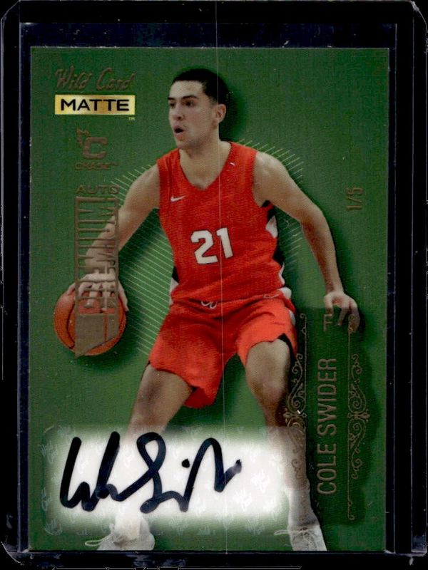 The Cole Swider 2022 Wild Card Matte #MB-A Autographs Gold Chase Gold Foil /5 Rookie card is 1 of 46 Cole Swider's card variations in the 2022 Wild Card Matte set being tracked by Sports Card Investor, including Autographs Black Silver Foil, Autographs White Silver Foil, Autographs Black Green Foil /200, Autographs Gold Silver Foil /200, and Autographs Silver Silver Foil /200.