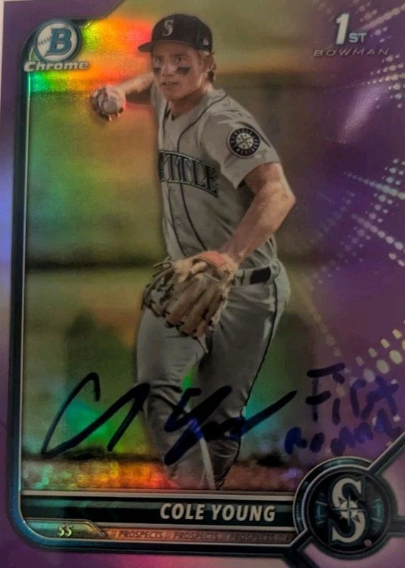Auctions Ending Soon for Cole Young 2022 Bowman Draft #CDA-CY Chrome DP Auto - Purple Refractor /250 (1st) RAW