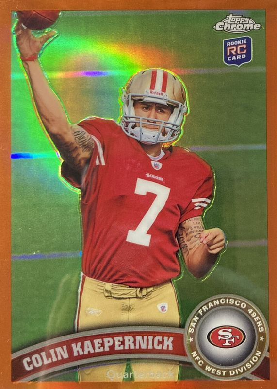 The Colin Kaepernick 2011 Topps Chrome #25 Orange Refractor Rookie card in Raw condition has moved down -$4.00 (-33.3%) in the last 30 days and was last sold for $8.00 .