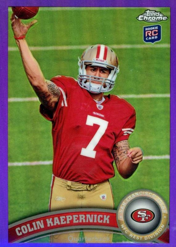The Colin Kaepernick 2011 Topps Chrome #25 Purple Refractor /499 Rookie card in Raw condition has not changed in price in the last 30 days and was last sold for $9.50 .