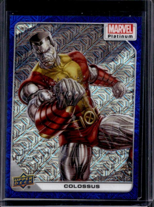The Colossus 2023 Upper Deck Marvel Platinum #64 Blue Traxx /499 card is 1 of 42 Colossus' card variations in the 2023 Upper Deck Marvel Platinum set being tracked by Sports Card Investor, including Base, Black Rainbow, Blue Rainbow, Blue Surge, and Purple Rainbow.