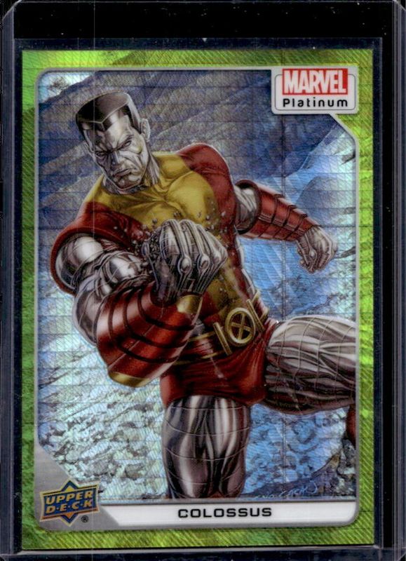 The Colossus 2023 Upper Deck Marvel Platinum #64 Yellow Spotlight /399 card is 1 of 42 Colossus' card variations in the 2023 Upper Deck Marvel Platinum set being tracked by Sports Card Investor, including Base, Black Rainbow, Blue Rainbow, Blue Surge, and Purple Rainbow.