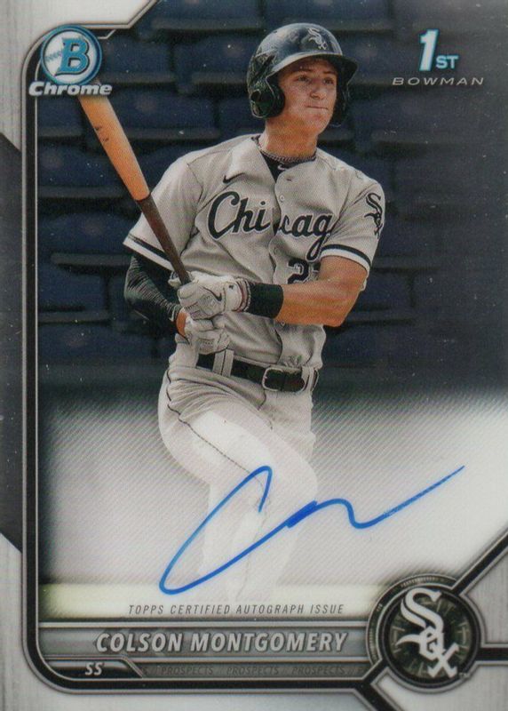 Colson Montgomery's Baseball cards are available in at least 27 sets. Colson Montgomery's biggest 7-day price movers are 2022 Bowman's Best #T22-CM Best of 2022 Autographs - Refractor, 2022 Bowman #CPA-CMY Chrome Prospect Auto (1st), and 2022 Bowman Sapphire Edition #BSPA-CMY Chrome Prospect Auto (1st).