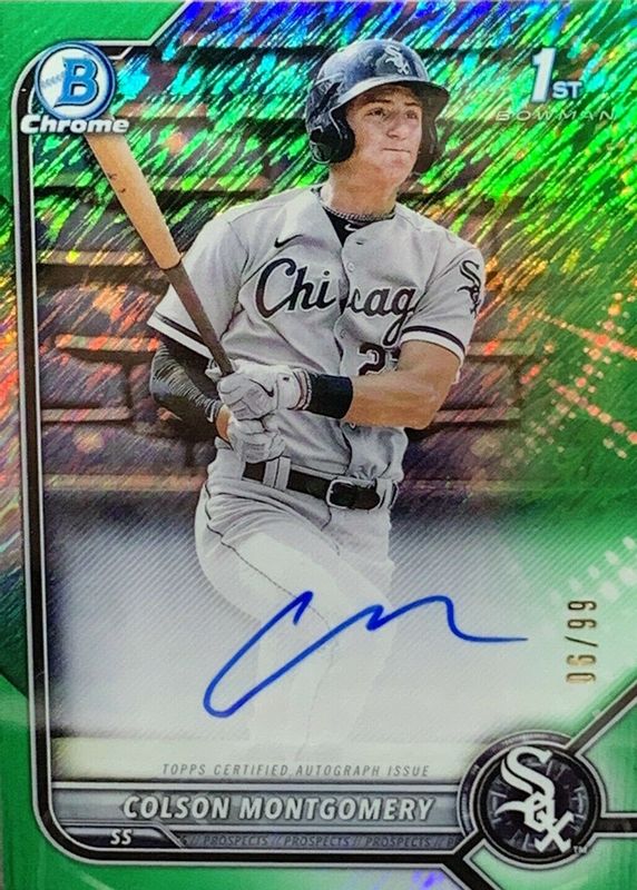 Colson Montgomery 2022 Bowman #CPA-CMY Chrome Prospect Auto - Green Shimmer Refractor /99 (1st) RAW Price Guide