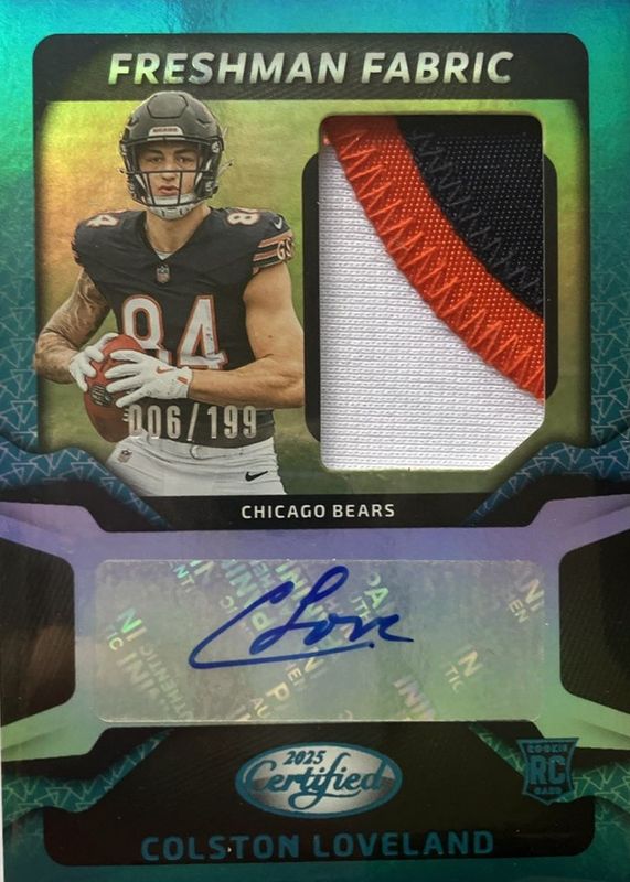 The Colston Loveland 2025 Certified #FBC-CLD Freshman Fabric Signatures - Mirror Teal /199 Rookie card in Raw condition has not changed in price in the last 30 days and was last sold for $42.00 .