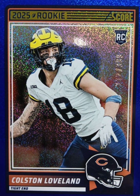 This card is 1 of 26 Colston Loveland's card variations in the 2025 Score set being tracked by Sports Card Investor, including Base, Gold, Green, Orange, and Purple.