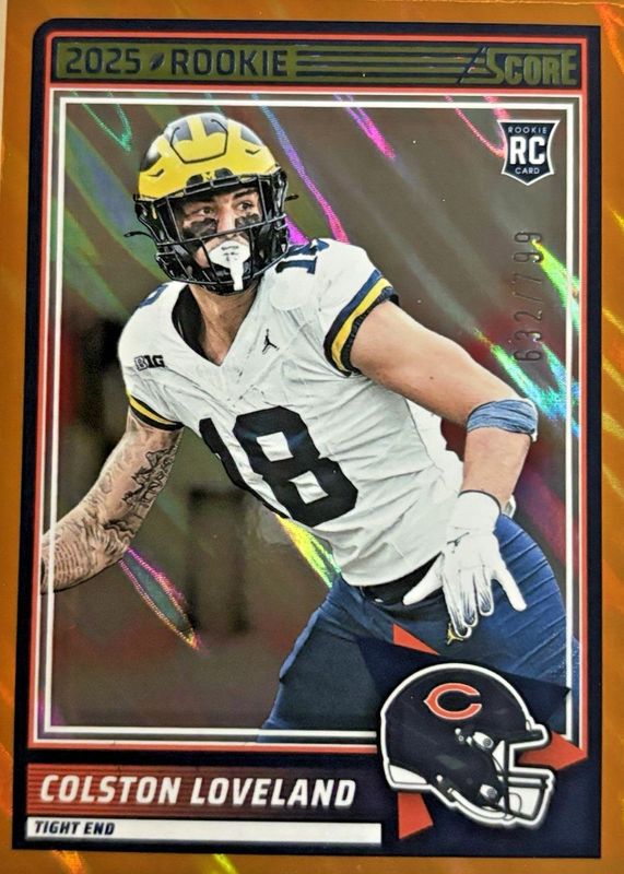 This card is 1 of 26 Colston Loveland's card variations in the 2025 Score set being tracked by Sports Card Investor, including Base, Gold, Green, Orange, and Purple.
