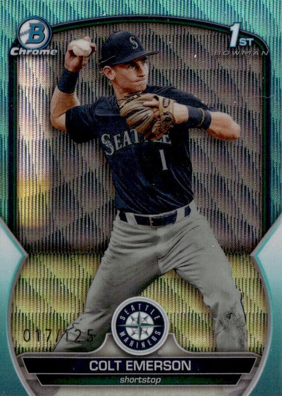 The Colt Emerson 2023 Bowman Draft #BDC-42 Chrome - Aqua Wave Refractor /125 (1st) card in Raw condition has moved down -$7.00 (-10.0%) in the last 30 days and was last sold for $63.00 .