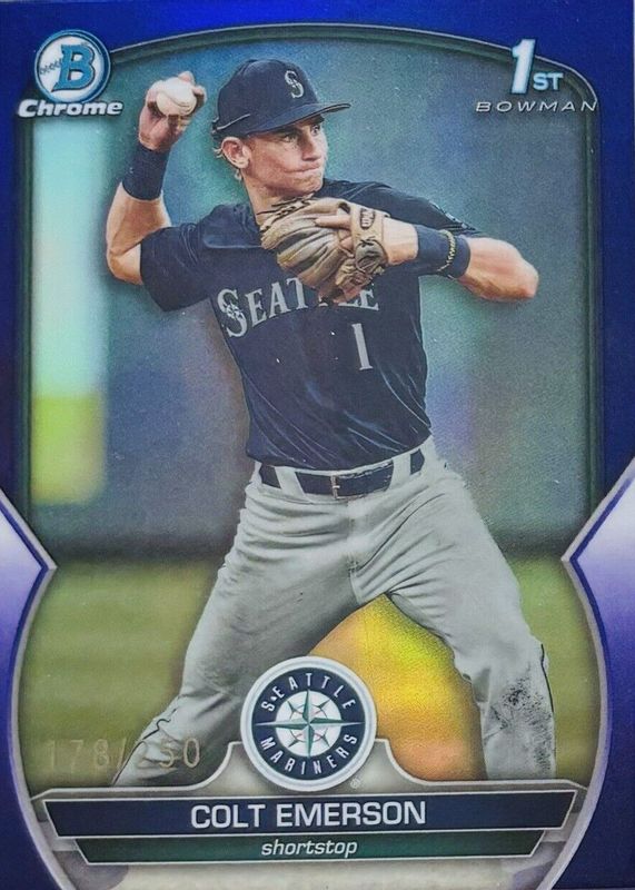 The Colt Emerson 2023 Bowman Draft #BDC-42 Chrome - Purple Refractor /250 (1st) card in Raw condition has moved down -$5.00 (-9.1%) in the last 30 days and was last sold for $50.00 .
