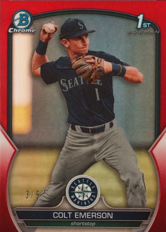 The Colt Emerson 2023 Bowman Draft #BDC-42 Chrome - Red Refractor /5 (1st) card in Raw condition has not changed in price in the last 30 days and was last sold for $979.00 .