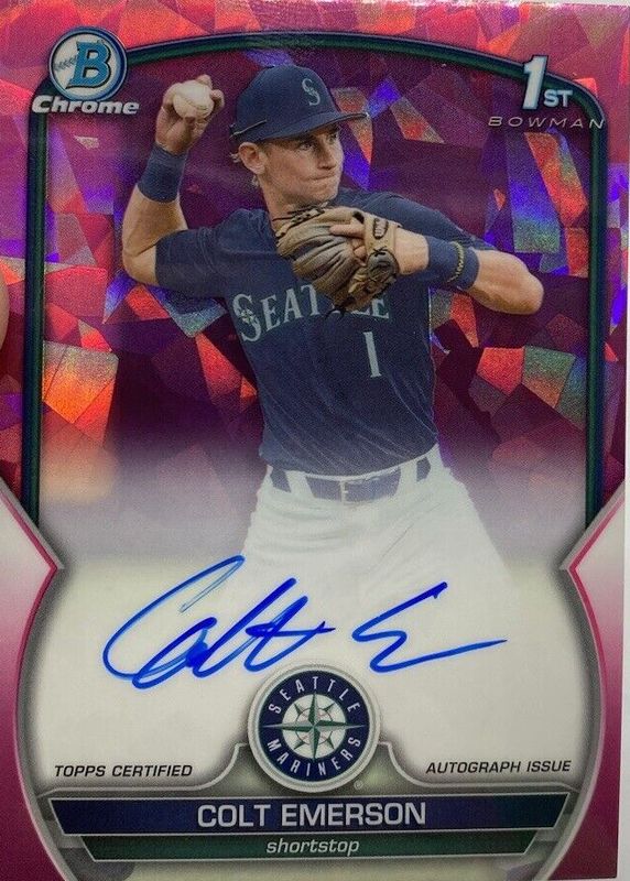 The Colt Emerson 2023 Bowman Draft Sapphire Edition #CDA-CE Chrome Prospect Auto - Padparadscha /1 (1st) card in Raw condition has not changed in price in the last 30 days and was last sold for $4,500.00 .