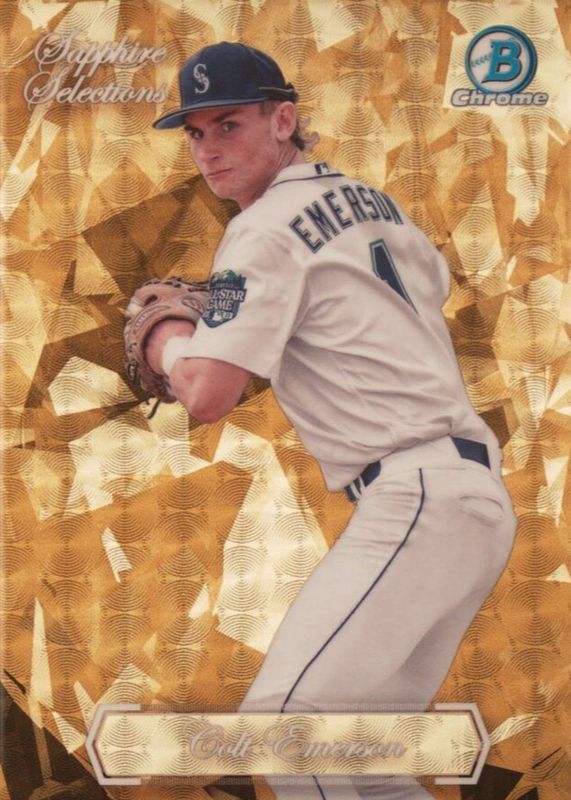 This card is 1 of 22 Colt Emerson's card variations in the 2023 Bowman Draft Sapphire Edition set being tracked by Sports Card Investor, including Chrome (1st), Chrome - Yellow /75 (1st), Chrome - Gold /50 (1st), Chrome - Orange /25 (1st), and Chrome - Black /10 (1st).
