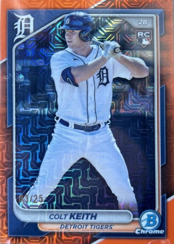 The Colt Keith 2024 Bowman Chrome Mega Box #34 Orange Mojo Refractor /25 Rookie card in Raw condition has not changed in price in the last 30 days and was last sold for $67.99 .