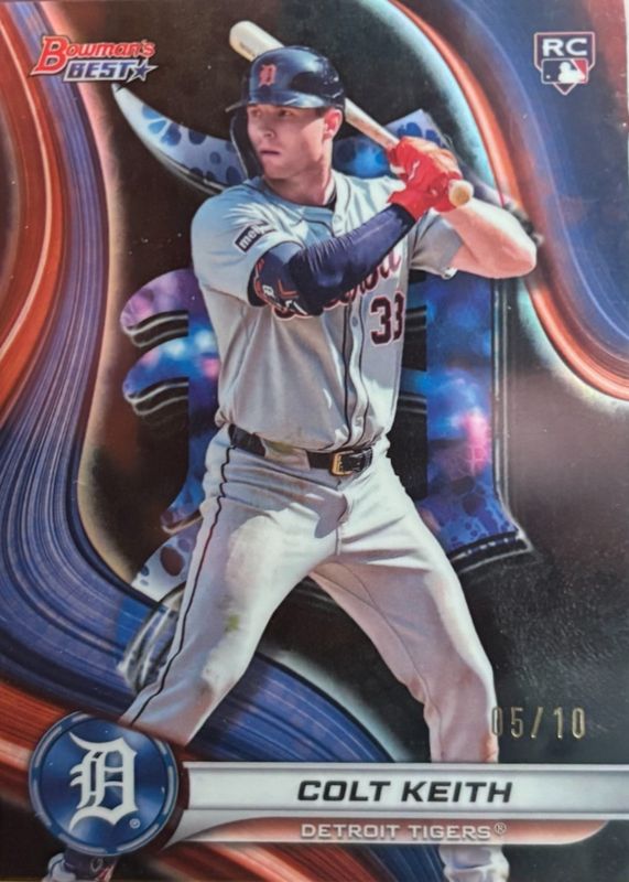 This card is 1 of 19 Colt Keith's card variations in the 2024 Bowman's Best set being tracked by Sports Card Investor, including Base, Refractor, Wave Refractor, Mini-Diamond Refractor /299, and Purple Mojo Refractor /250.