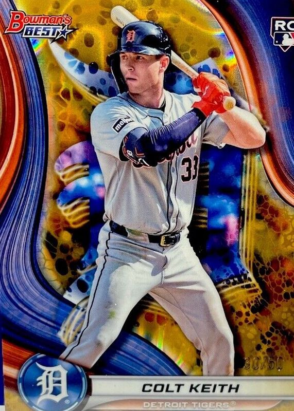 This card is 1 of 19 Colt Keith's card variations in the 2024 Bowman's Best set being tracked by Sports Card Investor, including Base, Refractor, Wave Refractor, Mini-Diamond Refractor /299, and Purple Mojo Refractor /250.