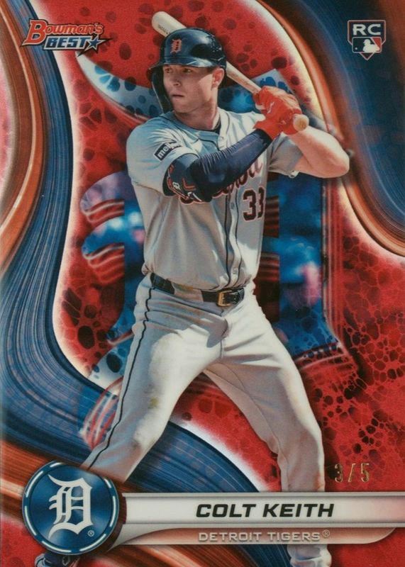 This card is 1 of 19 Colt Keith's card variations in the 2024 Bowman's Best set being tracked by Sports Card Investor, including Base, Refractor, Wave Refractor, Mini-Diamond Refractor /299, and Purple Mojo Refractor /250.