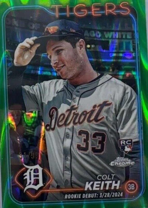 The Colt Keith 2024 Topps Chrome Update #USC178 Rookie Debut - Green RayWave Refractor /99 card in Raw condition has not changed in price in the last 30 days and was last sold for $4.00 .