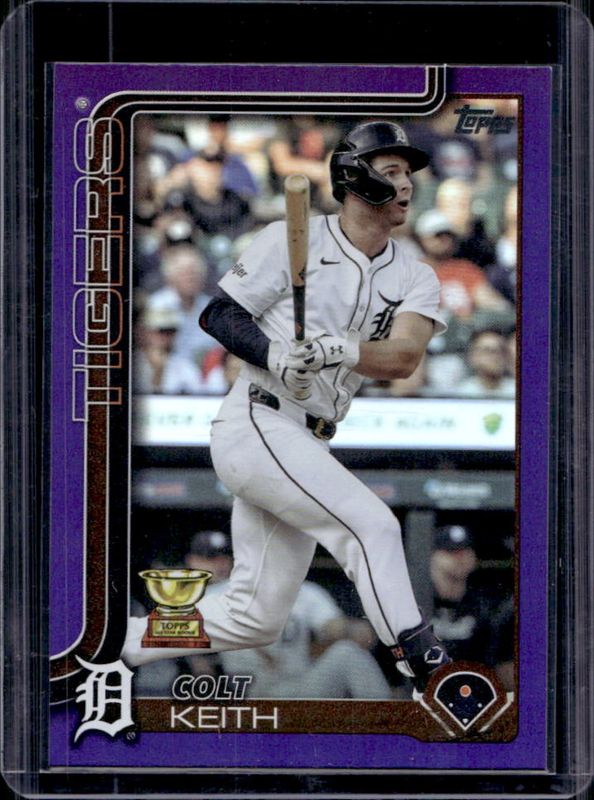 The Colt Keith 2025 Topps #180 Purple Rainbow /250 card is 1 of 81 Colt Keith's card variations in the 2025 Topps set being tracked by Sports Card Investor, including Base, Aqua Holo Foil, Diamante Foil, Holo Foil, and Pink Diamante Foil.