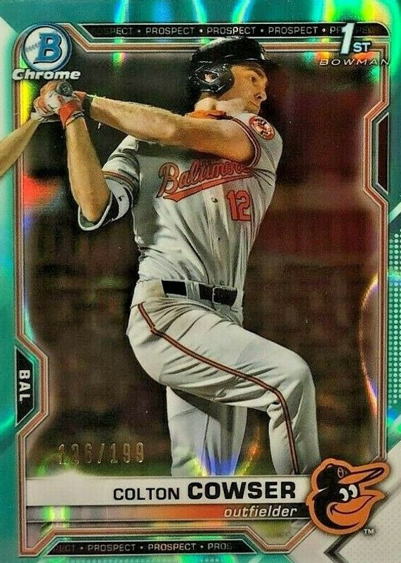 The Colton Cowser 2021 Bowman Draft #BDC-166 Chrome - Aqua Lava Refractor /199 (1st) card in Raw condition has moved up $3.00 (+50.1%) in the last 30 days and was last sold for $8.99 .