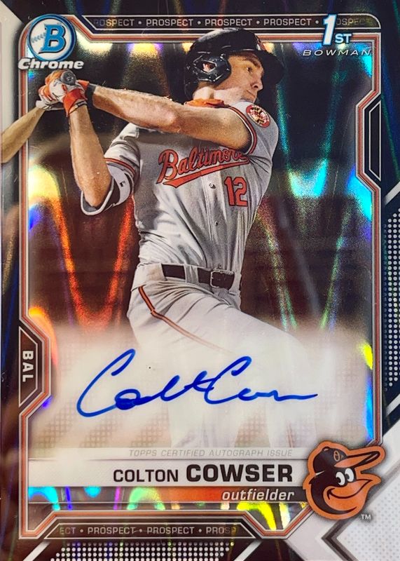 The Colton Cowser 2021 Bowman Draft #CDA-CC Chrome DP Auto - Black & White RayWave Refractor (1st) card in Raw condition has not changed in price in the last 30 days and was last sold for $45.02 .