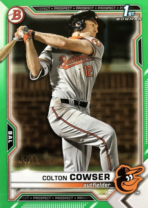 The Colton Cowser 2021 Bowman Draft #BD-166 Green /99 (1st) card in Raw condition has not changed in price in the last 30 days and was last sold for $0.99 .