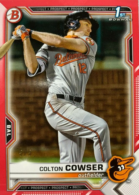 The Colton Cowser 2021 Bowman Draft #BD-166 Red /5 (1st) card in Raw condition has not changed in price in the last 30 days and was last sold for $96.00 .