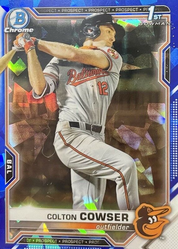 This card is 1 of 9 Colton Cowser's card variations in the 2021 Bowman Draft Sapphire Edition set being tracked by Sports Card Investor, including Chrome - Yellow /99 (1st), Chrome - Green /50 (1st), Chrome - Orange /25 (1st), Chrome - Aqua /20 (1st), and Chrome - Gold /15 (1st).