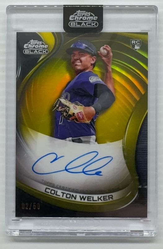 The Colton Welker 2022 Topps Chrome Black #CBA-CW Autographs - Gold Refractor /50 Rookie card is 1 of 13 Colton Welker's card variations in the 2022 Topps Chrome Black set being tracked by Sports Card Investor, including Autographs, Super Futures Autographs, Autographs - Refractor /150, Autographs - Green Refractor /99, and Autographs - Gold Mini Diamond Refractor /50.