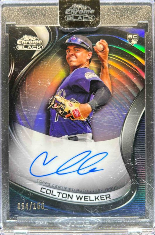 The Colton Welker 2022 Topps Chrome Black #CBA-CW Autographs - Refractor /150 Rookie card is 1 of 13 Colton Welker's card variations in the 2022 Topps Chrome Black set being tracked by Sports Card Investor, including Autographs, Super Futures Autographs, Autographs - Green Refractor /99, Autographs - Gold Mini Diamond Refractor /50, and Autographs - Gold Refractor /50.