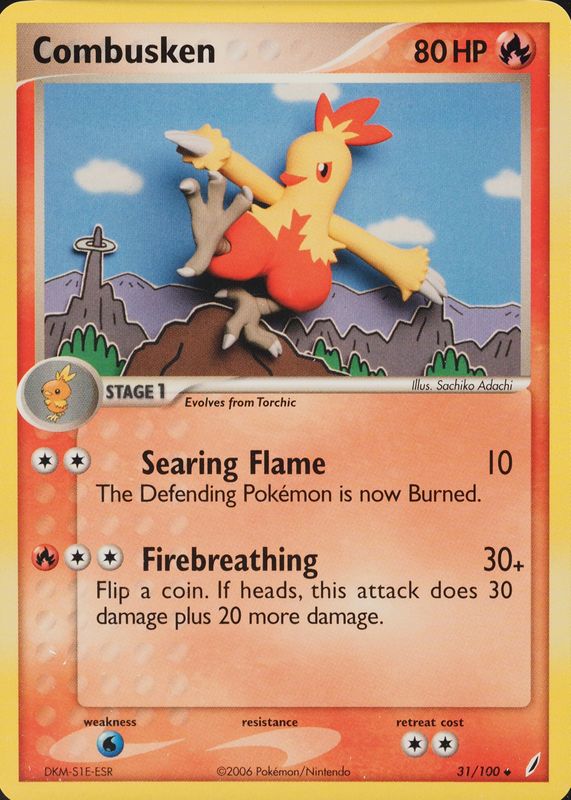 The Combusken 2006 EX: Crystal Guardians #031/100 Base card in Raw TCG (Near Mint) condition has moved up $2.00 (+101%) in the last 30 days and was last sold for $3.99 .