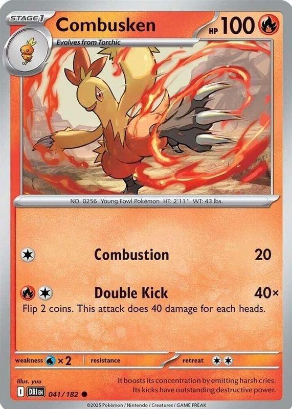The Combusken 2025 Scarlet & Violet: Destined Rivals #041/182 Reverse Holo card in Raw TCG (Lightly Played) condition has not changed in price in the last 30 days and was last sold for $0.99 .