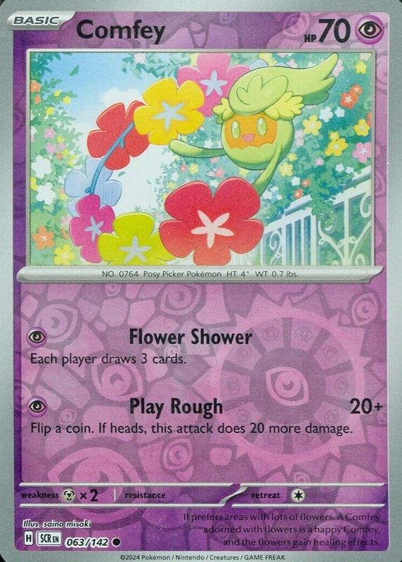 The Comfey 2024 Scarlet & Violet: Stellar Crown #063/142 Reverse Holo card in Raw TCG (Near Mint) condition has not changed in price in the last 30 days and was last sold for $1.12 .
