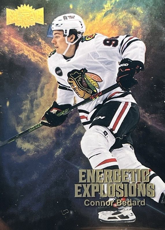 The Connor Bedard 2023 Skybox Metal Universe #EE-15 Energetic Explosions - Gold /99 Rookie card in Raw condition has not changed in price in the last 30 days and was last sold for $61.40 .