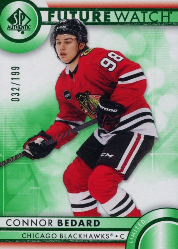 The Connor Bedard 2023 SP Authentic #110 Future Watch - Limited Green /199 Rookie card in Raw condition has not changed in price in the last 30 days and was last sold for $52.03 .