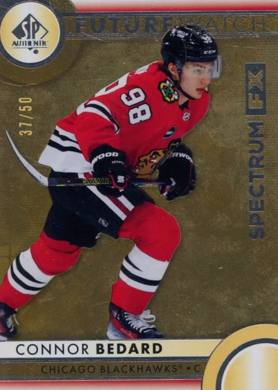 The Connor Bedard 2023 SP Authentic #S-91 Spectrum FX - Gold /50 Rookie card in Raw condition has not changed in price in the last 30 days and was last sold for $391.17 .